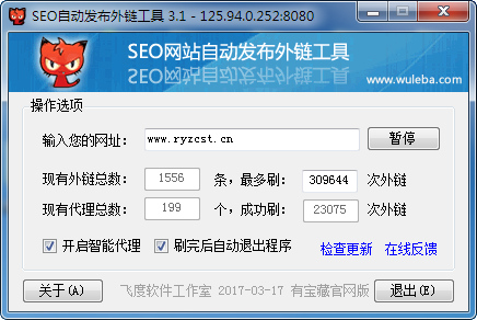 当你在其他网站搜索网址时,他们会把你的搜索词记录到数据库,然后可能会在某个页面展示出来。只要展示出来了,那么就等同于一个外链。(例如你搜索www.wuleba.com,有些网站会出现,最近搜索的是xxxx)这样就有一个外链了,本人收集了1300+外链,然后用软件自动去刷。本程序只是增加网站的曝光率,所以是不会被降权,或者Kill的,请放心使用!